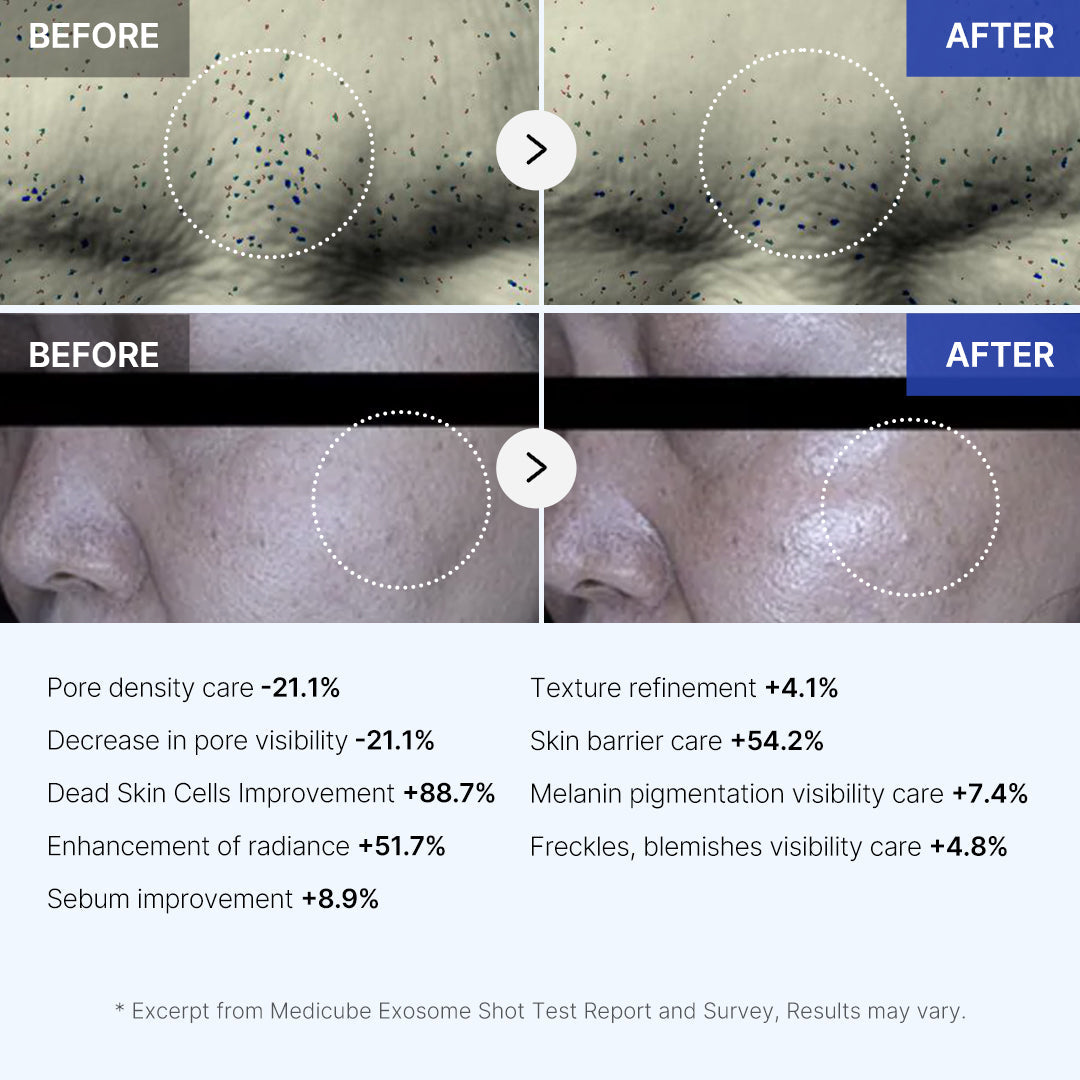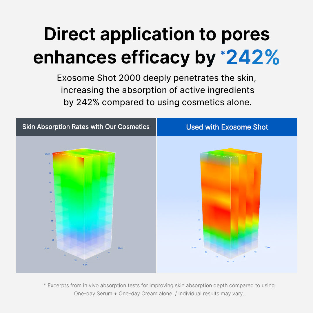 Please conduct a patch test and adjust the amount and frequency of use accordingly. - Q. I want to focus on managing my pores. Are there any synergisticproducts that work well together? When used in conjunction with the Exosome Shot, the One-day Serum and One-day Cream result in an 88% improvement in pore volume and an 85% improvement in pore area compared to using the Exosome Shot alone. For more effective pore management, we recommend using the Exosome Shot Ampoule first, followed by the One-day Serum, and finishing with the One-day Cream.